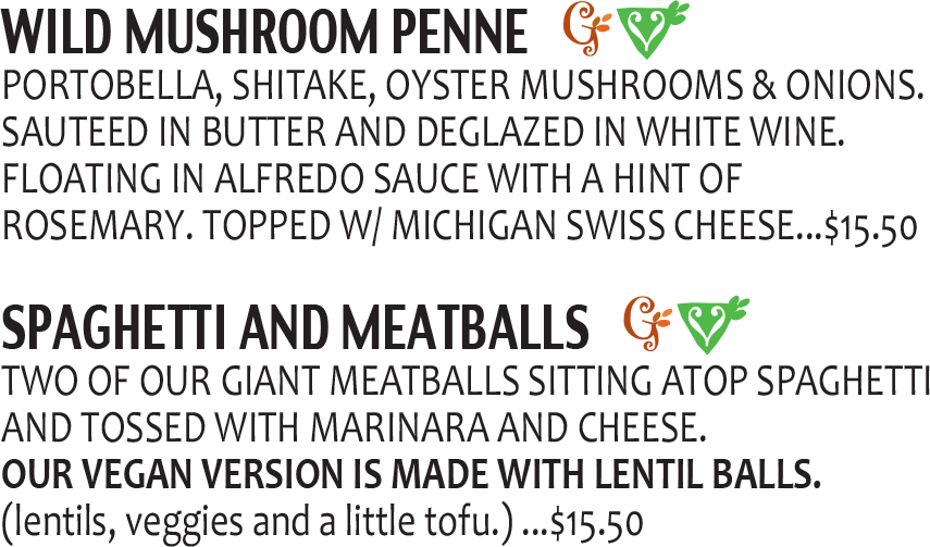 Our pasta creations are served with breadsticks. Side salad or soup is available for $4.